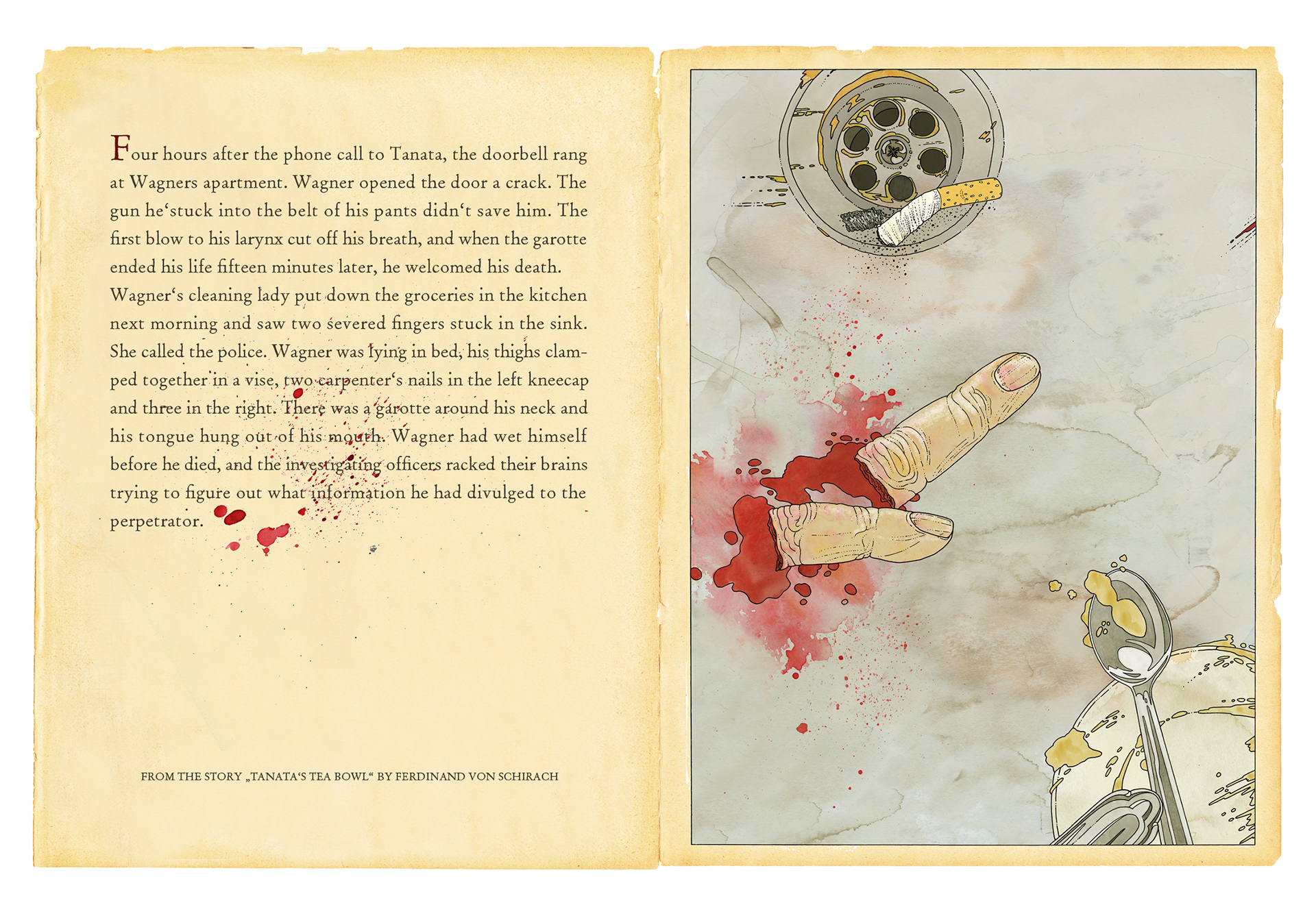 Illustrations for some short stories of Ferdinand von Schirach, a criminal lawyer and writer. Personal work.